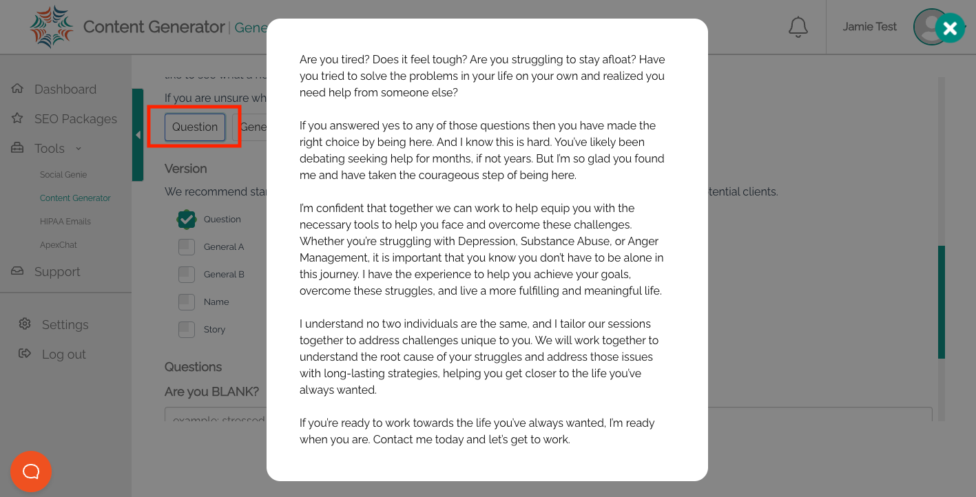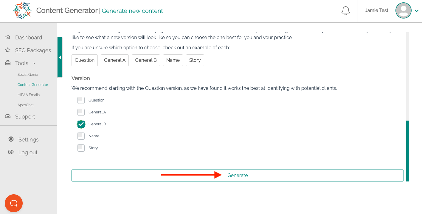 Step 2: Once logged in, select the Content Generator option on the left-hand side.