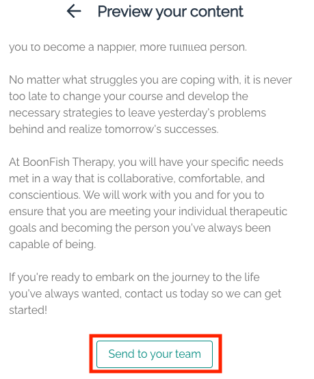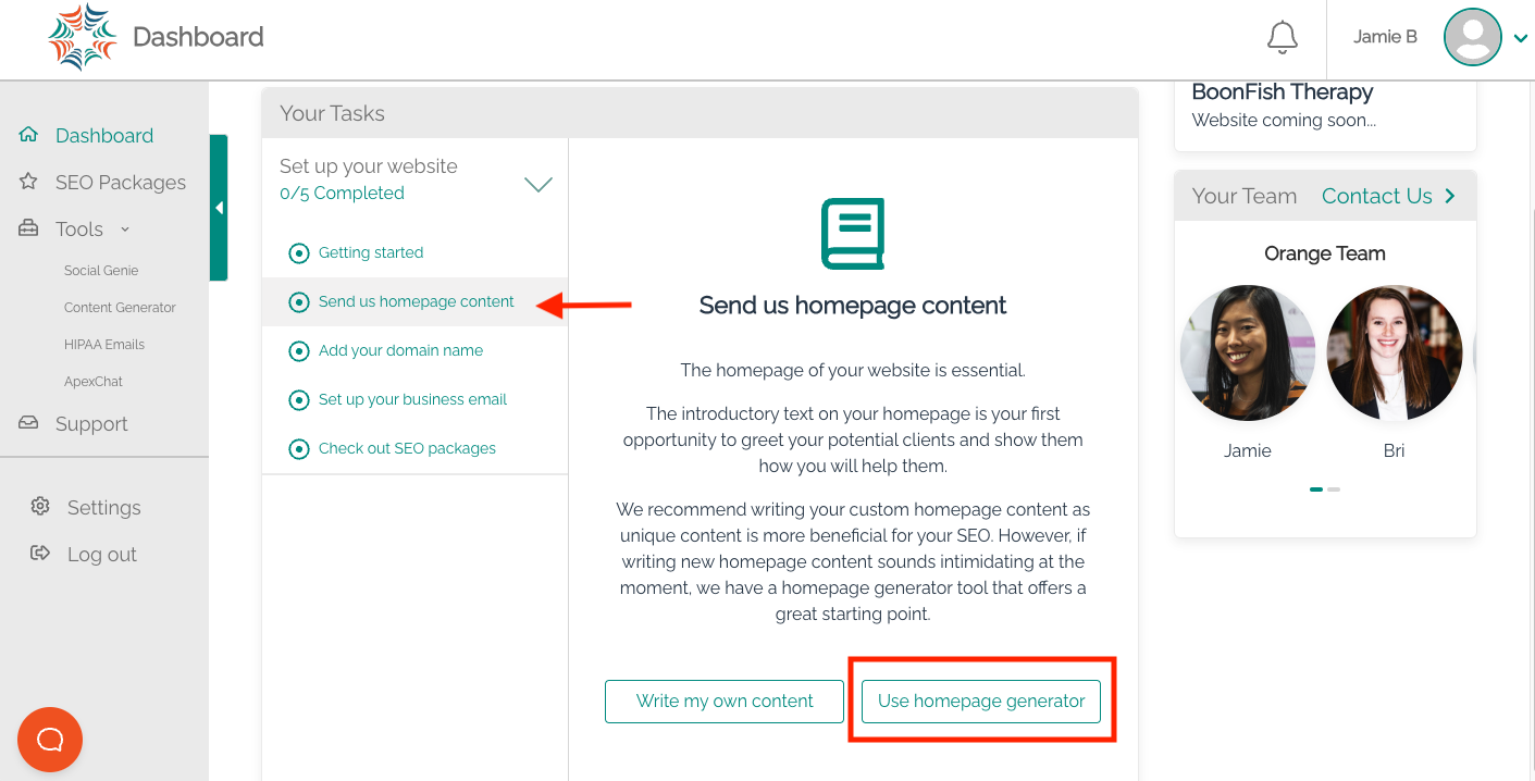 You can view our homepage content options, and then either copy that content to your website yourself or auto-send it to your team. Please keep in mind that once you submit one option to your team, you are not able to select a different option. However, you can always view and copy the homepage options via the Dashboard. Below we'll go over these two options.