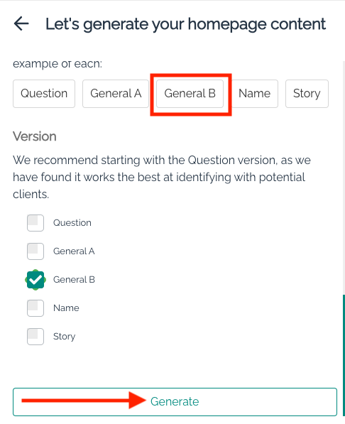 Step 5: Click on the "x" to close the window and view other options. Once you have selected the homepage version you like, select the "Generate" button at the very bottom of the page.